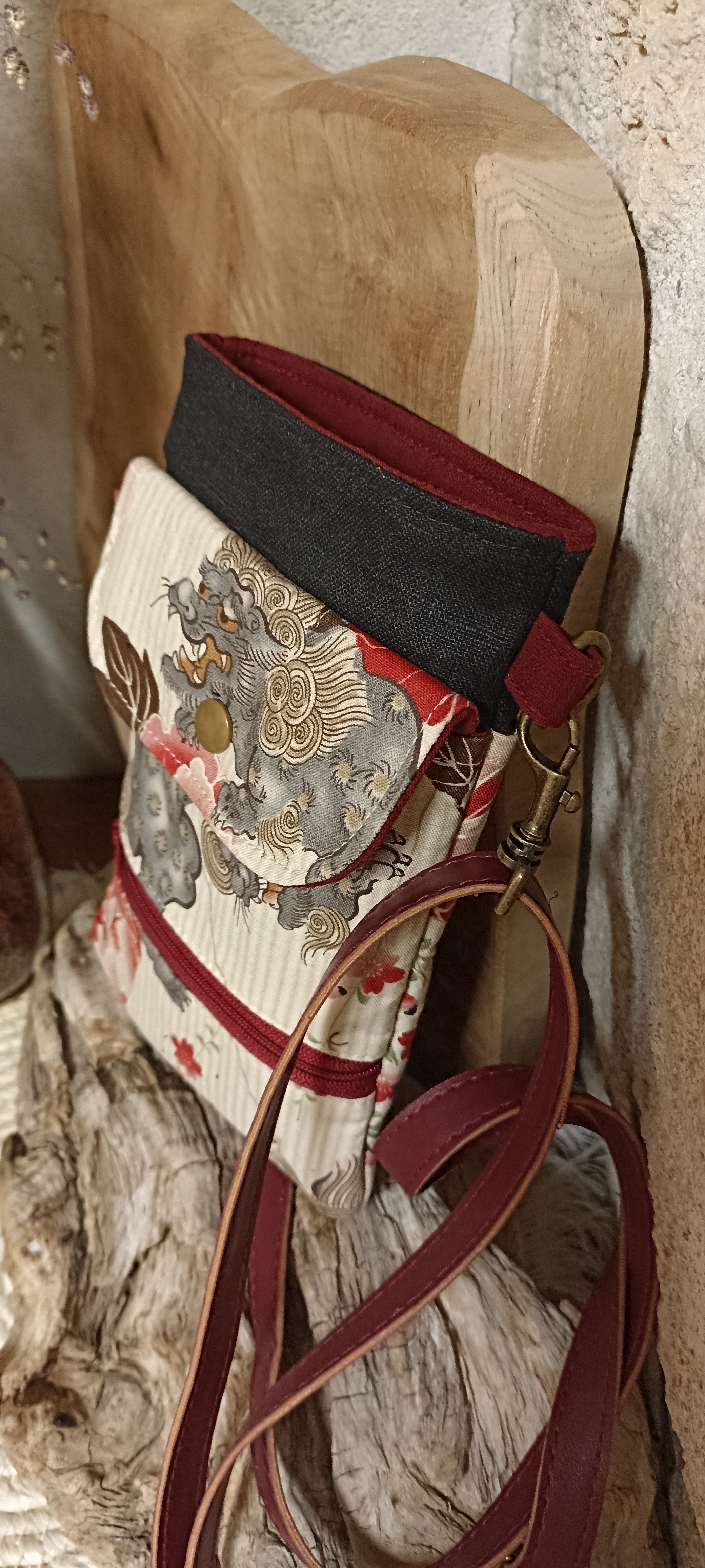 - Rabat en coton japonais imprimé Komainu, entièremement doublé en lin. Fermeture par un bouton pression de couleur dorée.