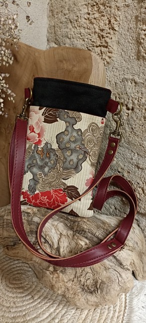 - Une poche avant pour la partie monnaie, en coton japonais imprimé et entièrement doublée. Fermeture par un zip de couleur bordeaux.