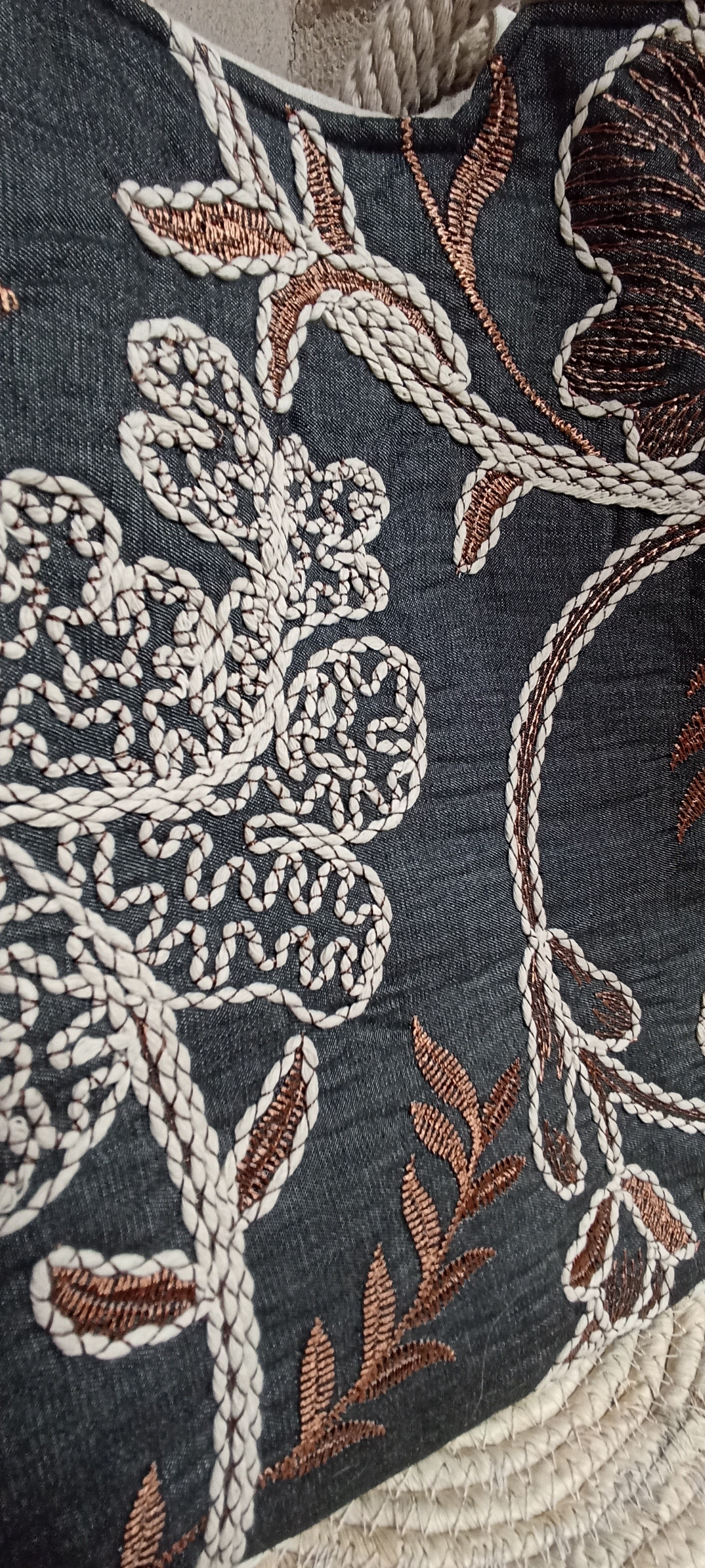 Anses éffilochées au bout pour lui donner son coté bohème et sa magnifique broderie pour le côté chic. Il adopte tous les styles et se porte aussi bien à l'épaule qu'à la main. Il suffit de raccourcir la corde et de faire un noeud pour le porter plus court.